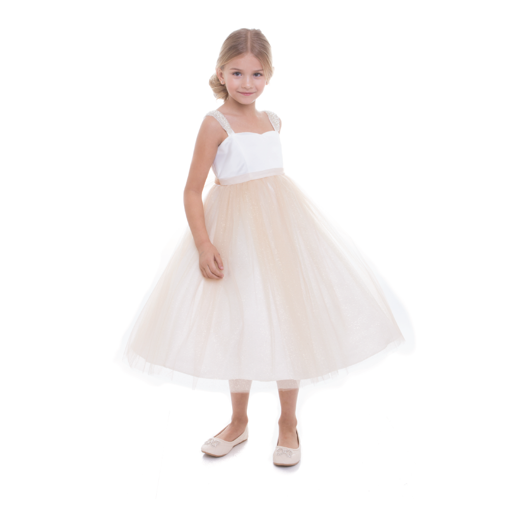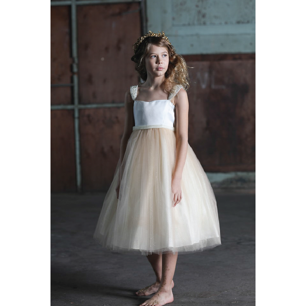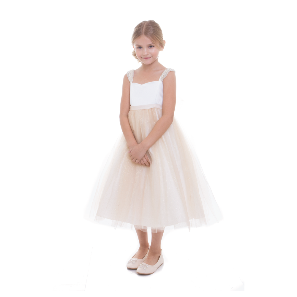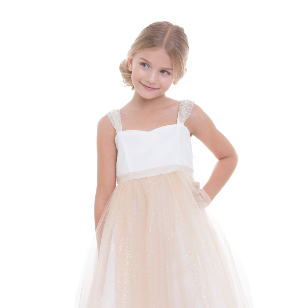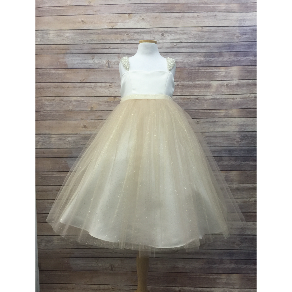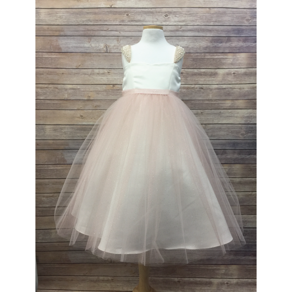 Satin top dress with handmade pearl shoulder patch and glitter mesh skirt.